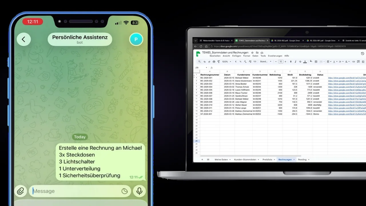 Ein Telegram-Bot, der Rechnungen per Chat-Eingabe erzeugt. n8n-Workflows übernehmen Nummerierung, PDF-Erstellung und Ablage in Google Sheets. Storno und Korrektur per Knopfdruck – ohne Login, ohne Custom-Code.